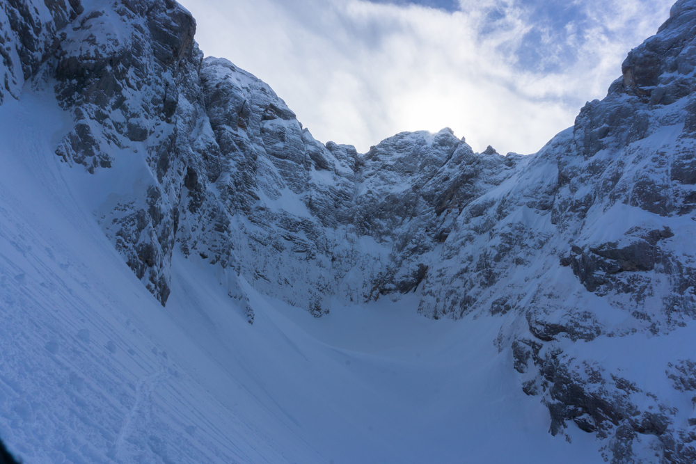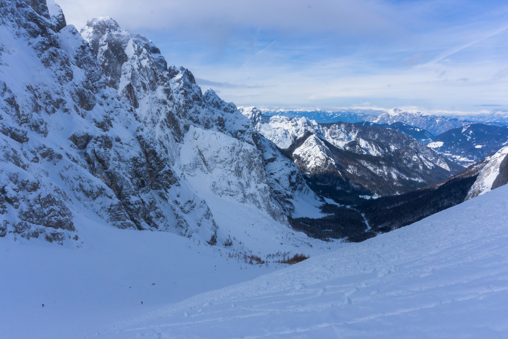 Preteklo soboto smo izkoristlili za smučanje v mehkem pršiču pod Kriško steno. Iz Ljubljane smo se odpravili do Kranjske Gore in naprej proti Vršiču. Parkirali smo pri drugem ovinku, nato pa s smučmi sledili nespluženi cesti do odcepa za Krnico. Mimo Koče v Krnici smo nadaljevali proti vznožju Kriške stene. Lep dan in dobre razmere so privabile veliko turnih smučarjev, zato je bilo pobočje polno vzpenjajočih se skupin, najbolj zgodnji pa so že uživali v spustu.